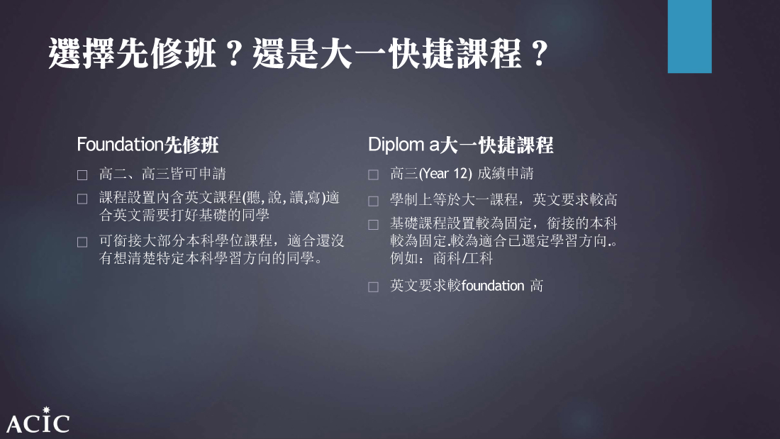 Copyright © 2004-2022 ACIC 澳洲留學顧問中心台灣分公司 All rights reserved.